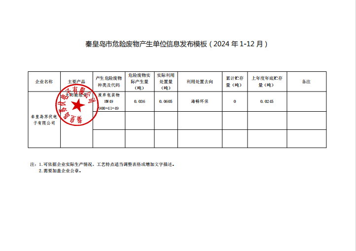 秦皇島市危險廢物產生單位信息發布(2024 年 1-12 月)